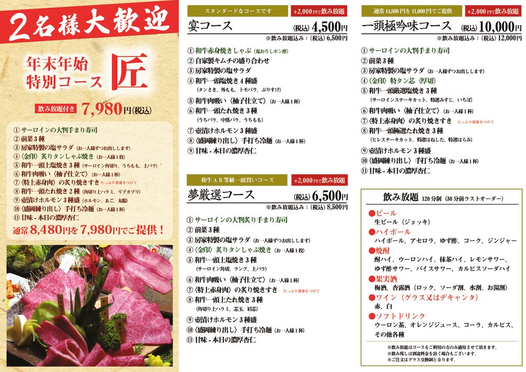 年末年始、忘新年会のお得なコース! 一頭買い焼肉を堪能できるコースをご準備致しました。